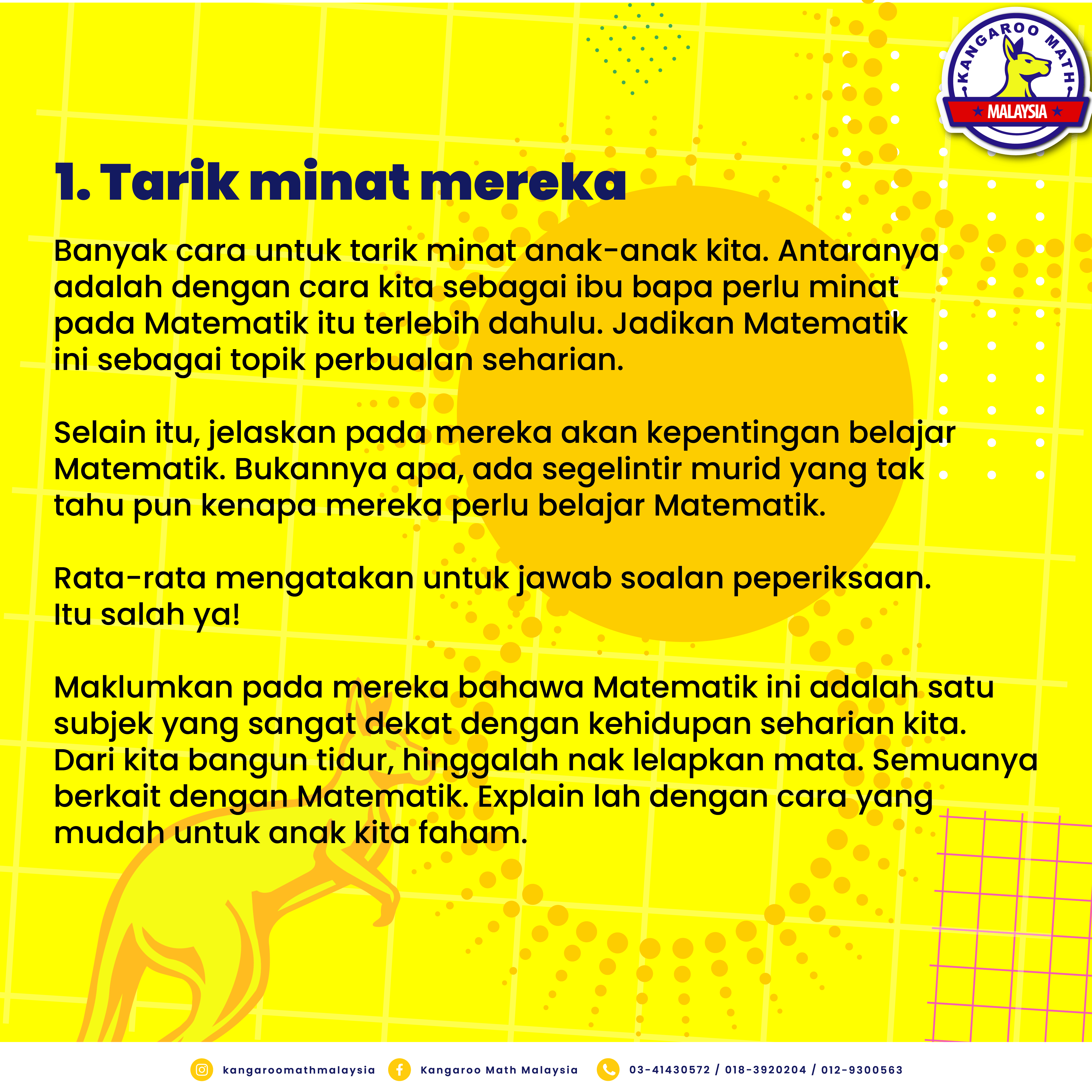Contohnya penggunaan wang (bahasa inggeris dan matematik). Antara punca utama pelajar lemah matematik adalah cara belajar pelajar itu. Semoga perkongsian ini membantu mereka untuk jawab . Seorang baca dan seorang lagi semak kemudiansaling bertukar peranan. Bila murid semak, dia akan alert denganjawapan rakan. Tips mengajar matematik sekolah rendah terutama murid murid lemah tip belajar gps bestari . Buat game spelling bee ke, aktiviti . Cikgu mohamad hakim kongsi tip 'tackle' anak lemah matematik. Tips mengajar matematik sekolah rendah . Namun, menurut cikgu mohamad hakim ada empat cara untuk membantu mereka yang mendapat markah rendah dalam subjek tersebut. Bila mengajar secara kelas, pasti ada murid yang ketinggalan. Yang mana mereka tak faham tapi mereka tak tanya pula. Guru dan mak ayah boleh cuba cara ini di rumah! Cara mengajar murid lemah matematik. Apabila sudah mahir, tingkatkan nilai nombor dan ajar anak .
